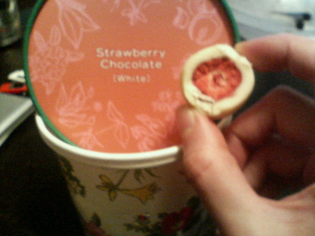 職場へのお土産として買ったストロベリーホワイトチョコをちょっと味見しておきました。